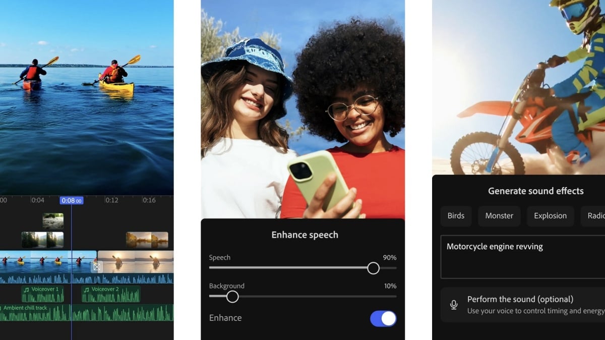 A diferencia de la versión de escritorio actual de Premiere, que requiere una suscripción, la versión móvil de Premiere es gratuita de descargar y usar. Adobe dice que solo los usuarios que necesitan almacenamiento adicional o desean usar las funciones de IA de la aplicación deben pagar, aunque aún no parece que Adobe haya publicado información de precios. Hasta ese momento, Adobe está presionando algunas de sus características de IA aquí, incluidos los efectos de sonido generativos, que combina su voz con las indicaciones de texto para producir una voz estilizada. También hay un discurso mejorado, que utiliza IA en un intento por mejorar la calidad de sus grabaciones de voz.
