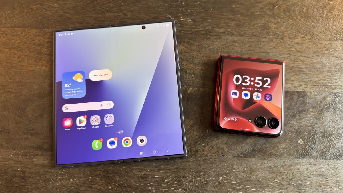 Un Galaxy Z Fold 7 (izquierda) desplegado al lado de un RAZR ULTRA PLOTADO (derecha). Crédito: Michelle Ehrhardt.