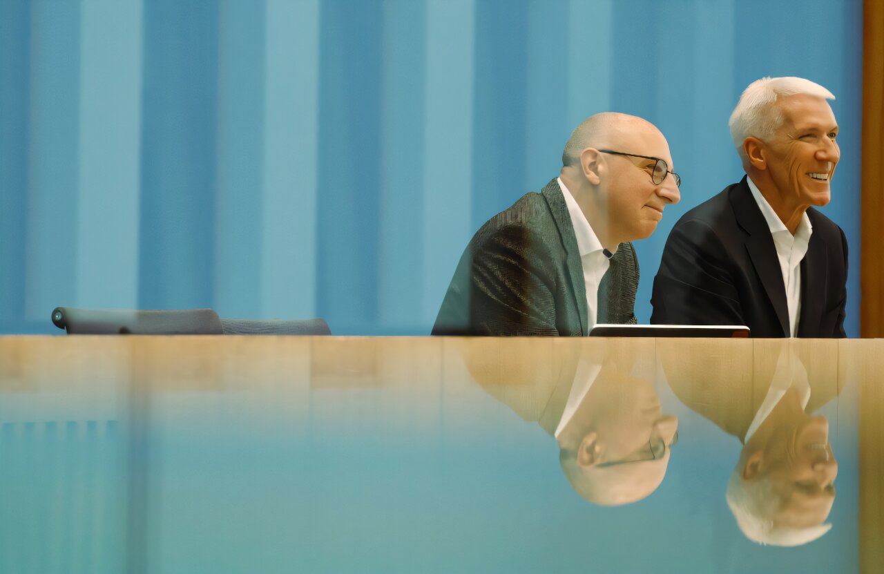 Sinan Selen (L), el jefe designado del Servicio de Espía Doméstico BFV de Alemania, y el presidente de Bitkom, Ralf Wintergerst, ofrece una conferencia de prensa en Berlín.