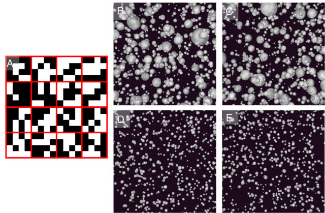 (A) Imagen de ejemplo que muestra el número total de píxeles blancos (awhite) representativos de los límites entre las partículas de Li, y el número total de píxeles dentro de cada corte atotal, dividido en 16 cortes (descritos en rojo) para el cálculo de ID. Cada una de las 16 rebanadas contiene 16 píxeles. (B – E) Imágenes SEM sintéticas de PSD conocidas utilizadas para el cálculo de ID (30). (B y C) Distribución del tamaño de partícula lognormal, tamaño medio de partículas de 0.12 y parámetro de forma de distribución de 0.6. (D y E) Distribución normal del tamaño de partícula, tamaño medio de partícula de 0.1 y parámetro de forma de distribución de 0.025. Estos valores se miden en unidades de licuadora arbitrarias. Reproducido, Copyright 2016, Elsevier (30). Crédito: Actas de la Academia Nacional de Ciencias (2025). Doi: 10.1073/pnas.2502518122