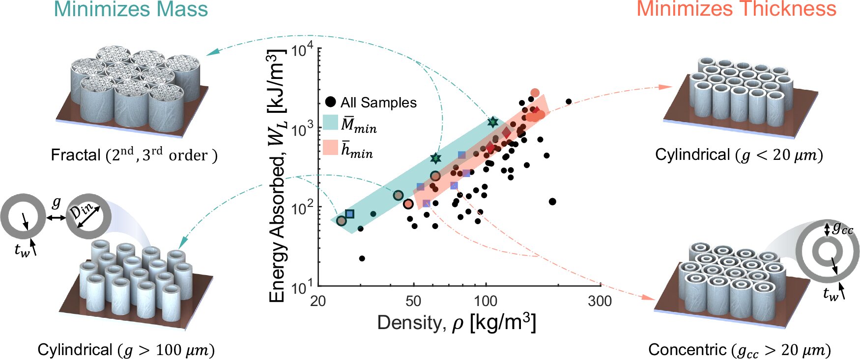 Escala de absorción de energía con densidad, destacando arquitecturas óptimas de nanotubos de carbono (VACNT) alineados verticalmente. Crédito: Nature Communications (2025). Doi: 10.1038/s41467-025-60300-8