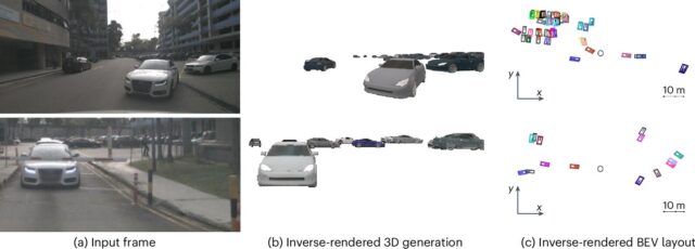 Generación de diseño. A, imágenes para dos escenas observadas por una sola cámara. B, tiempo de prueba optimizado de objetos renderizados inversos. C, diseños BEV de las escenas. En el diseño de BEV (una representación común para tareas de conducción autónoma), las cajas negras representan la verdad del suelo y las cajas de colores representan cajas BEV predichas. Crédito: Nature Machine Intelligence (2025). Doi: 10.1038/s42256-025-01083-x
