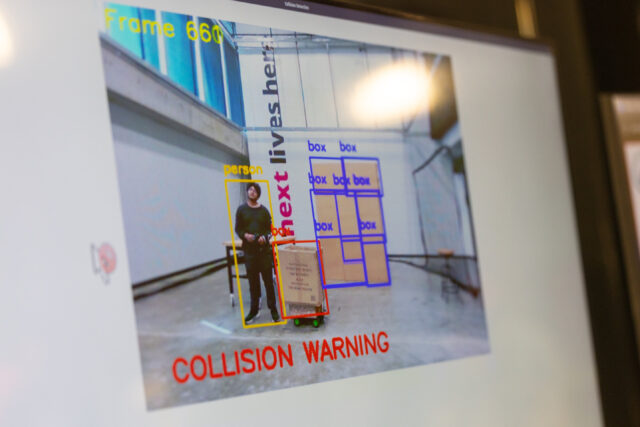 Para otra manifestación, una caja con ruedas que se paraba cuando una carretilla elevadora se acercó al trabajador estudiantil desde atrás y su reloj inteligente sonó una alarma para advertirle sobre el peligro que se acercaba.