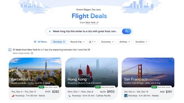 Según el gigante tecnológico, la herramienta AI entiende la intención de viajes, lo que le permite buscar términos como “vea las flores de cerezo en Japón” o “escapadas románticas de fin de semana” en lugar de tener que seleccionar manualmente una fecha y un destino. Una vez que su intención haya sido interpretada, las herramientas pasarán por el inventario de vuelo existente de Google Flight de más de 300 socios para encontrar el mejor acuerdo de vuelo para usted.