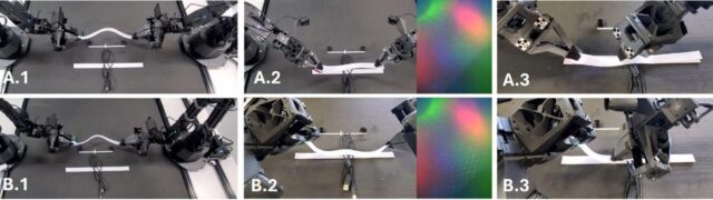Basado en la información de la cámara, el brazo empuja ambos extremos del velcro (A.1, b.1). Usando información táctil, detecta la orientación de la cinta y ajusta la postura y el ángulo para alinear la superficie del gancho con la superficie del bucle (a.2, b.2). El velcro es fijo y el brazo derecho lo presiona para garantizar una conexión firme (A.3, b.3). Diferentes movimientos de manipulación de cintas se generan automáticamente para adaptarse a la situación. Crédito: Universidad de Tohoku