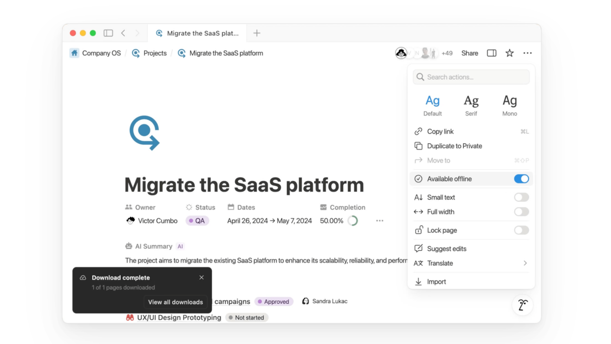 Puede hacer esto desde la aplicación de escritorio de noción o desde la aplicación móvil. Abra la página de noción que desea editar mientras fuera de línea, luego haga clic en el botón de menú de tres puntos. Habilite la función fuera de línea disponible. Verá una barra de progreso a medida que se descarga la página.
