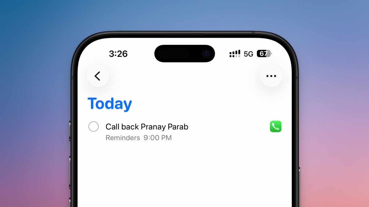 Pero este recordatorio no está aislado a la aplicación del teléfono. Si abre la aplicación de recordatorios y vaya a la lista de hoy, también encontrará el recordatorio de la llamada aquí. Incluso hay un botón útil para colocar la llamada en el recordatorio en sí.