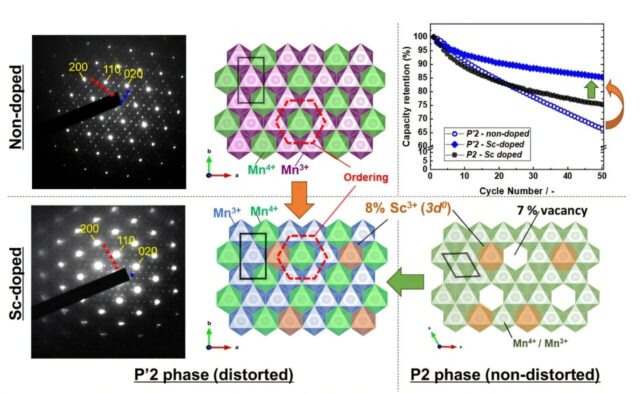 “Anteriormente, descubrimos que el dopaje SC en los electrodos O2 P’2 Na2/3 (MN1-XSCX) puede mejorar el rendimiento de la batería y la estabilidad a largo plazo”, explica el profesor Komaba. “Sin embargo, el mecanismo exacto para esta mejora sigue sin resolverse, y no estaba claro si este efecto es generalmente aplicable. En este estudio, estudiamos sistemáticamente los politis P2 y P’2 de Na2/3 (MN1-XSCX) O2 para comprender el papel del dopaje SC”.