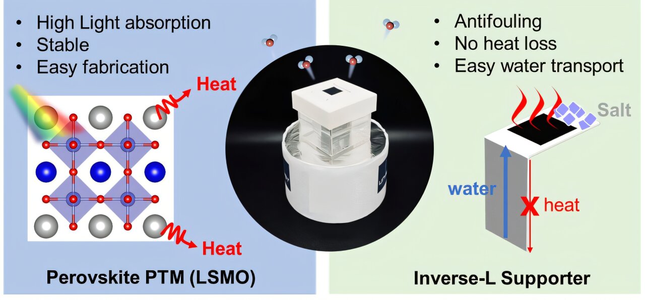 El núcleo de este evaporador solar presenta una estructura de papel de forma inversa y inversa distintiva. Gracias a sus propiedades que absorben el agua, similar al papel de tornasol, el agua de mar naturalmente mueve hacia arriba a lo largo de la columna de papel. Cuando el agua llega a la parte superior, se encuentra con un material fototérmico calentado que lo convierte rápidamente en vapor bajo la luz solar. El material empleado, la₀.₇sr₀.₃mno₃ (LSMO), un semiconductor basado en perovskita, exhibe una alta eficiencia térmica, lo que permite tasas de evaporación que son de 8 a 10 veces más rápidas que los métodos convencionales.