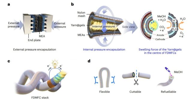 Las celdas de combustible flexibles en forma de fibra pueden funcionar incluso cuando se doblan o cortan. Crédito: Nat. Mater. (2025). Doi: https://doi.org/10.1038/s41563-025-02319-2