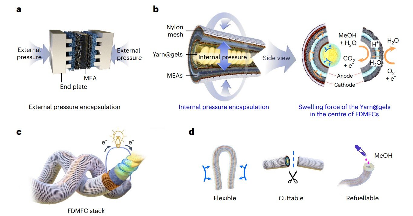 Más información: Yongjiang Yuan et al, celdas de combustible flexibles en forma de fibra con encapsulación de presión interna mediada por gel, materiales de la naturaleza (2025). Dos: 10.1038/s41563-025-02319-2