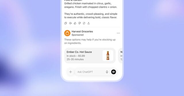 Por el momento, los anuncios en ChatGPT serán una “prueba” en los EE. UU. y aparecerán al final de las respuestas “cuando haya un producto o servicio patrocinado relevante según su conversación actual”. La respuesta aparece en la parte superior de la respuesta, con una línea visible que separa un resultado relacionado con “Patrocinado”. En la demostración de OpenAI, a una consulta sobre “ideas auténticas de platos mexicanos” le sigue un anuncio de una aplicación de entrega de comestibles con salsa picante, mientras que otro anuncia alojamiento en una ciudad sobre la que el usuario busca información, con la opción de “chatear con” ese patrocinador para obtener más información.