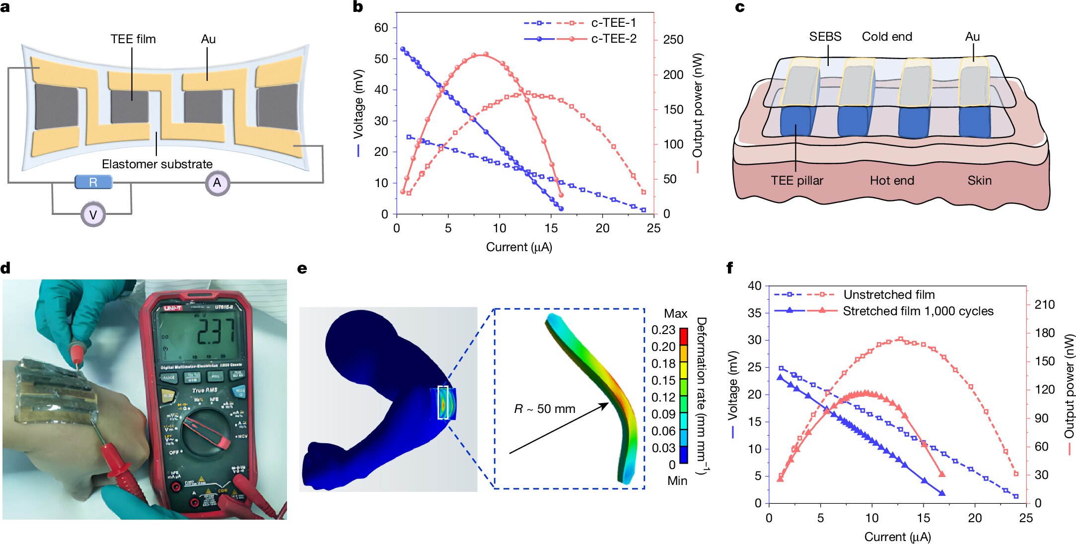 Fabricación y medición de los TEG intrínsecamente elásticos. Crédito: Naturaleza (2025). Doi: 10.1038/s41586-025-09387-z