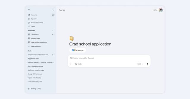 En gemini.google.com, encontrará una nueva sección “Cuadernos” en el panel lateral encima de Gemas y Chats. Estos son los mismos cuadernos que aparecen en la aplicación NotebookLM. Como tal, puede continuar creando resúmenes de videos, infografías y otros resultados de Studio.