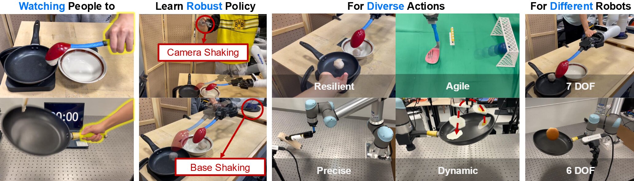 Nuestro equipo en la Universidad de Illinois Urbana-Champaign, junto con colaboradores en la Universidad de Columbia y UT Austin, ha estado explorando esa misma pregunta. ¿Podrían los robots ver a alguien golpear un clavo o sacar una albóndiga, y luego descubrir cómo hacerlo ellos mismos, sin sensores costosos, trajes de captura de movimiento o horas de teleperación remota?