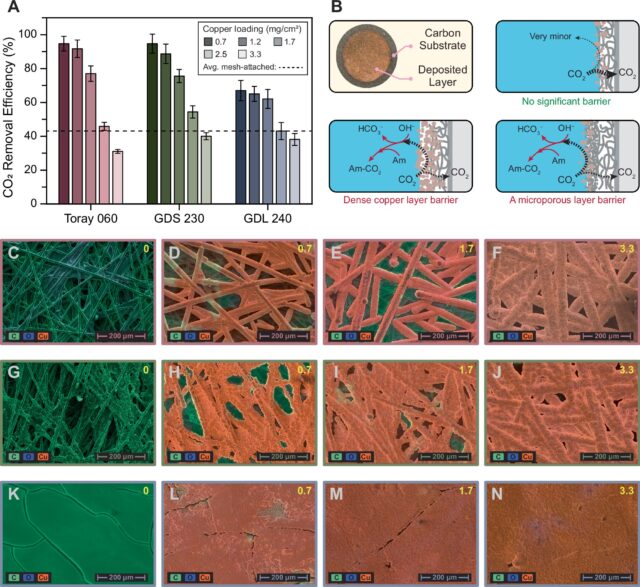 Al ingeniería de los electrodos de difusión de gas, el equipo pudo lograr más del 90% de eliminación de CO₂, casi un 50% más que los enfoques de EMAR tradicionales. Ese es un costo de captura de aproximadamente $ 70 por tonelada métrica de CO₂, lo que lo hace competitivo con los métodos de fregado amino de última generación, según Ph.D. Estudiante Ahmad Hassan.