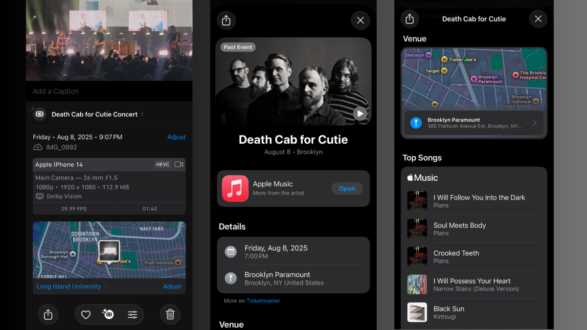 Digamos que asistió a un concierto de Muerte Cab for Cutie, como lo hizo el editor adjunto de Lifehacker, Joel Cunningham, el mes pasado en Brooklyn. Al desplazarme a través de estas fotos y videos en su biblioteca, verá aparecer un icono de boletos de concierto a lo largo de la parte inferior de la pantalla. Toque esto, y extraerá la página de metadatos de la imagen, completa con una etiqueta etiquetada como “Death Cab for Cutie Concert”. Si toca esa etiqueta, extraerá una página dedicada a los detalles que rodean el evento, incluida la fecha, hora, ubicación, lugar del concierto del concierto, e incluso una lista establecida de canciones tocadas. Además de los detalles sobre el programa en sí, también obtendrá contenido acompañado asociado con el artista que actuó, como las listas de reproducción de Apple Music y los próximos programas. La etiqueta del evento podría incluso extenderse a las cosas que hiciste inmediatamente antes o después del espectáculo: en el rollo de cámara de Joel, el restaurante cercano al que comió antes del show de Death Cab también está etiquetado con un ícono de boletos.