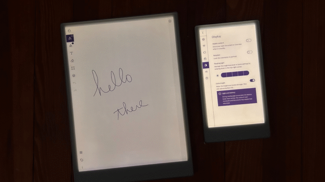 El notable Paper Pro Move con modo extra brillante habilitado, en comparación con un Kindle Scribe con brillo máximo. Crédito: Joel Cunningham