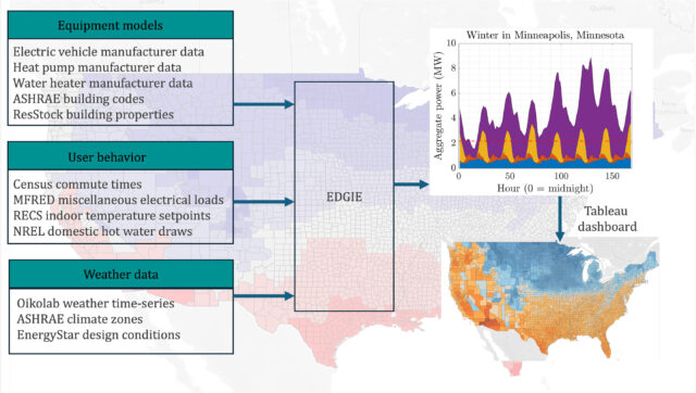 La caja de herramientas de Edgie de código abierto utiliza modelos de alta resolución de abajo hacia arriba para estimar los impactos de la electrificación del hogar y el vehículo en las redes de distribución en cada condado de los 48 estados inferiores de los Estados Unidos. Crédito: Sostenibilidad de informes celulares (2025). Doi: 10.1016/j.crsus.2025.100518