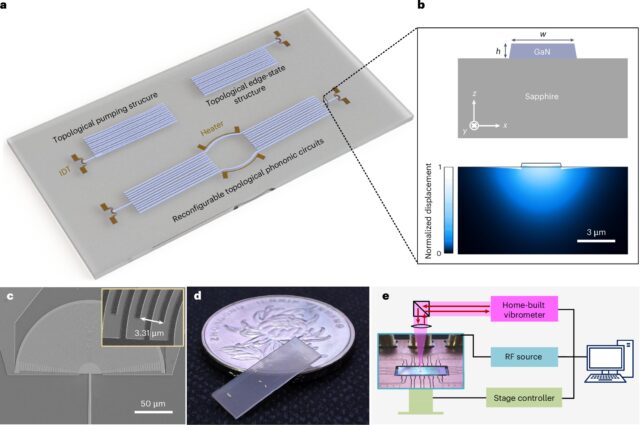 Plataforma topológica de chips fonónicos. A, ilustración de dispositivos integrados que usan ondas de sonido topológicamente protegidas, incluida una bomba de fonón, una guía de onda de borde y un modulador de intensidad. B, arriba: sección transversal de la guía de onda Gan-on-Sapphire, que muestra su ancho (W) y grosor (H). Abajo: patrón de vibración simulado de la onda de sonido guiada principal. C, imagen del microscopio electrónico del transductor de aluminio utilizado para generar fonones de 1,5 GHz. D, foto del chip fonónico topológico fabricado. E, diagrama de la configuración experimental, que combina un vibrómetro óptico personalizado con una etapa motorizada para mapear cómo las ondas de sonido viajan en el chip. Crédito: Xu et al.