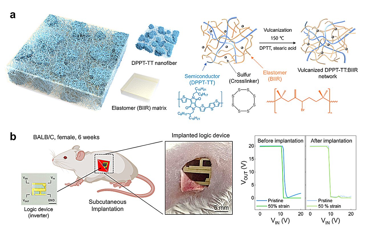 Circuito de semiconductores y lógicos estirables para dispositivos bioelectrónicos flexibles implantables. (a) Ilustración esquemática del semiconductor estirable biocompatible, formado combinando un polímero semiconductor orgánico (DPPT-TT) con un elastómero de grado médico (BIIR) a través de un proceso de vulcanización de mezclas. (b) Fotografía de un circuito lógico (inversor) fabricado utilizando el semiconductor desarrollado, implantado subcutáneamente en un ratón de laboratorio, junto con curvas características de transferencia de voltaje (VTC) medidas antes y después de la implantación. Crédito: Jung, KH et al. Un transistor orgánico elastomérico biocompatible para la electrónica implantable. Nature Electronics doi: 10.1038/s41928-025-01444-9
